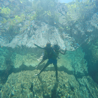 On fait une première plongée masque/tuba dans le lac Barracuda connu pour son effet miroir que l'on ne peut pas soupçonner de l'extérieur de l'eau. Une fois la tête sous l'eau, la magie opère : la roche présente au dessus de l'eau l'est également sous la surface et le spectacle est grandiose. La roche n'en finit plus de descendre, les reliefs sont impressionnants. Puis, direction une petite île sauvage où nous mangeons un bon barbecue de poissons en amoureux car les deux autres personnes ont quitté le bateau et le guide mange à l'écart. Cela nous change d'El Nido où tout le monde mangeait au même endroit, bruyant etc. On en profite pour se relaxer pleinement.